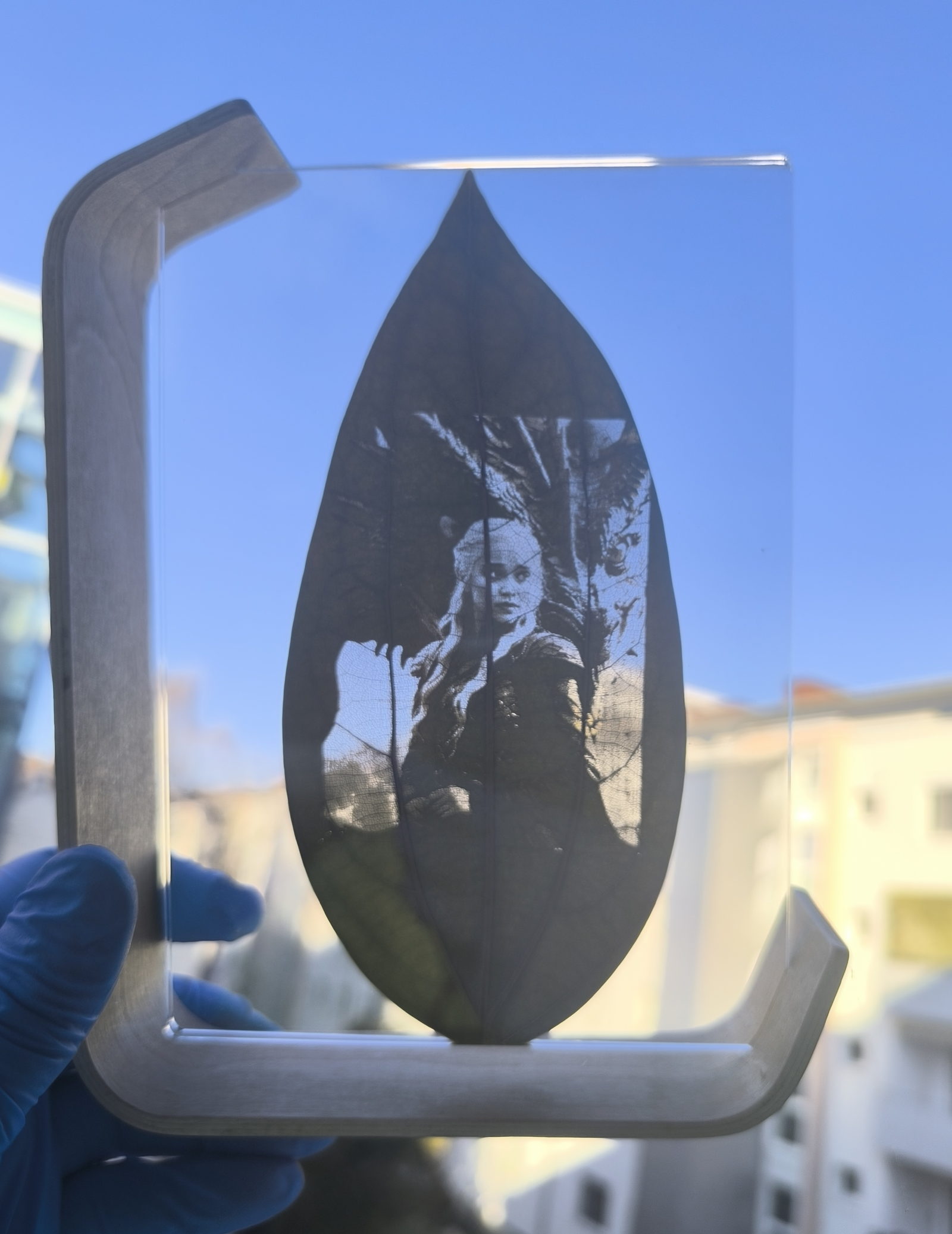 Ihr Foto wird kunstvoll in die natürlichen Blattadern graviert – jedes Stück ist ein Unikat. In Kombination mit einem Massivholz-Glasrahmen kommen die feinen Gravurdetails perfekt zur Geltung. Ideal als stilvolles Geschenk oder einzigartige Dekoration.